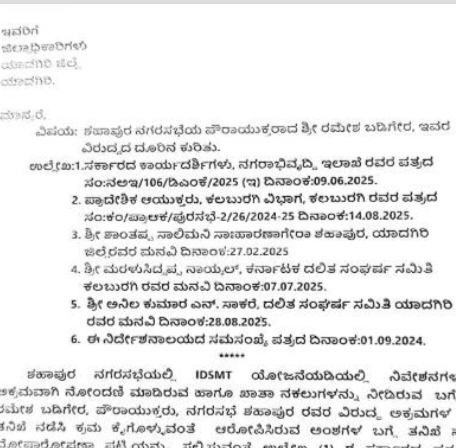 ಯಾದಗಿರಿ ಜಿಲ್ಲೆಯ ಶಹಾಪುರ ನಗರಸಭೆಯ ಐ ಡಿ ಎಸ್ ಎಂ ಟಿ ಯೋಜನೆಯಲ್ಲಿ ನಿವೇಶನಗಳು ಅಕ್ರಮ ನೊಂದಣಿ ಮತ್ತು ಅಕ್ರಮ ಖಾತಾ ನಕುಲುಗಳ ಬಗ್ಗೆ ಎರಡನೇ ಹಂತದ ತನಿಖಾ ತಂಡವು ರಾಜಕೀಯ ವ್ಯಕ್ತಿಗಳು ಹಾಗೂ ಭ್ರಷ್ಟಧಿಕಾರಿಗಳೊಂದಿಗೆ ಕೈಜೋಡಿಸಿ ನೂರಾರು ನಿವೇಶನಗಳು ಅಕ್ರಮವಾಗಿದ್ದರು ದಲಿತ ಅಧಿಕಾರಿಗಳ ಅವಧಿಯಲ್ಲಿ ಮಾತ್ರ ತನಿಖೆ ಕೈಗೊಂಡು ಕೇವಲ 27 ನಿವೇಶನಗಳು ಮಾತ್ರ ಅಕ್ರಮವಾಗಿವೆ ಎಂದು ಸರಕಾರಕ್ಕೆ ಕೊಟ್ಟಿರುವ ದೋಷಪೂರಿತ ವರದಿಯನ್ನು