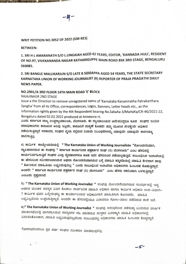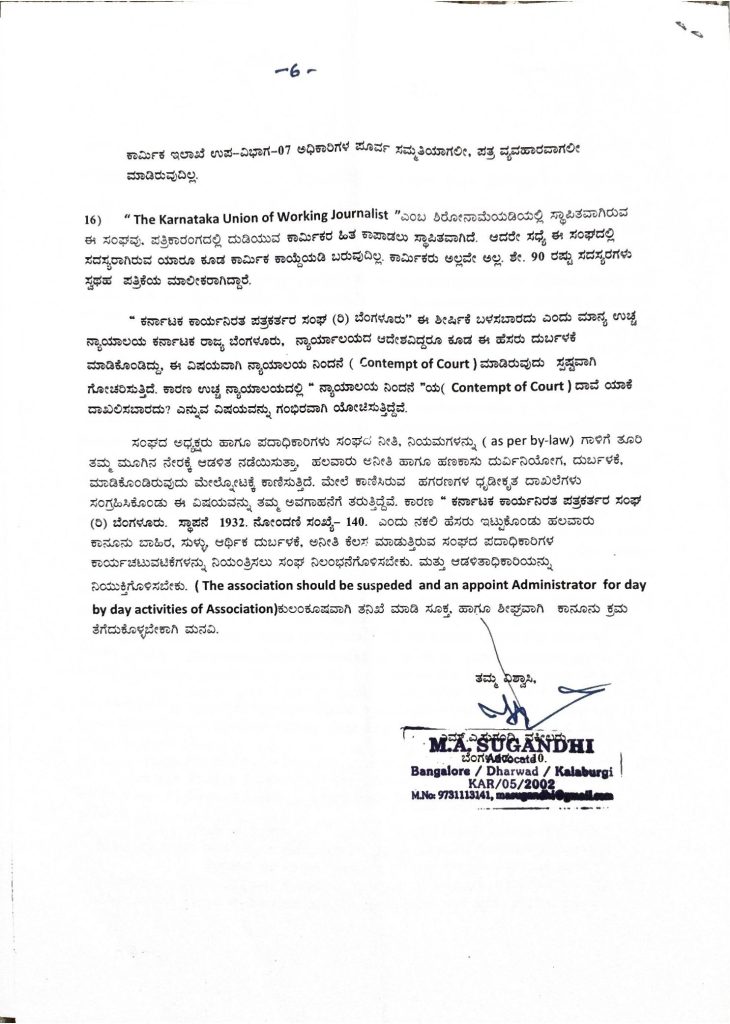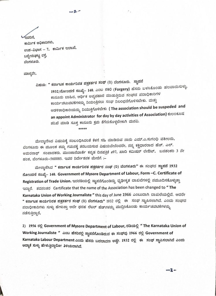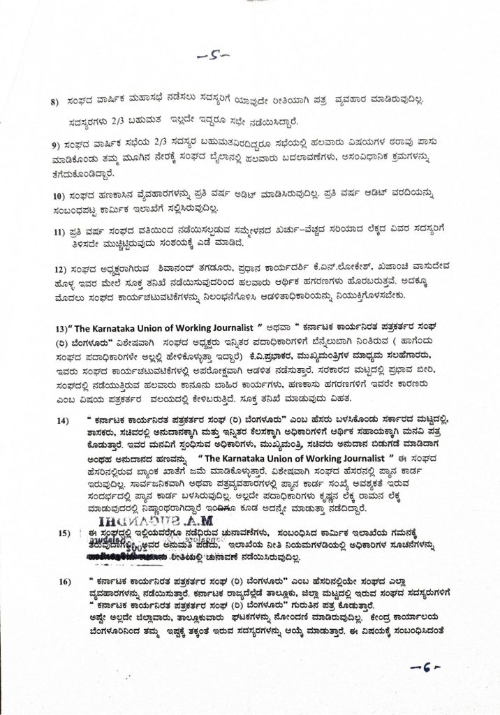 ಬೆಂಗಳೂರು: ಕರ್ನಾಟಕ ಕಾರ್ಯನಿರತ ಪತ್ರಕರ್ತರ ಸಂಘ(ನೋ.)ದಲ್ಲಿ ಪತ್ರಕರ್ತರಲ್ಲದ ಅನರ್ಹರಿಗೆ ಸದಸ್ಯತ್ವ ನೀಡಲಾಗಿದೆ, ಕಾರ್ಮಿಕ ಇಲಾಖೆ ಕಾಯ್ದೆಯಡಿ ನೋಂದಾಯಿಸಿಕೊಂಡಿರುವ ಕರ್ನಾಟಕ ಕಾರ್ಯನಿರತ ಪತ್ರಕರ್ತರ ಸಂಘದಲ್ಲಿ ಕಾನೂನುಬಾಹಿರವಾಗಿ ಪತ್ರಿಕಾ ಮಾಲೀಕರಿಗೂ ಸದಸ್ಯತ್ವ ಕೊಡಲಾಗಿದೆ ಎಂಬ ಗಂಭೀರ ಆರೋಪಗಳು ಆಗಿಂದಾಗ್ಗೆ ಕೇಳಿಬರುತ್ತಿದ್ದವು.
