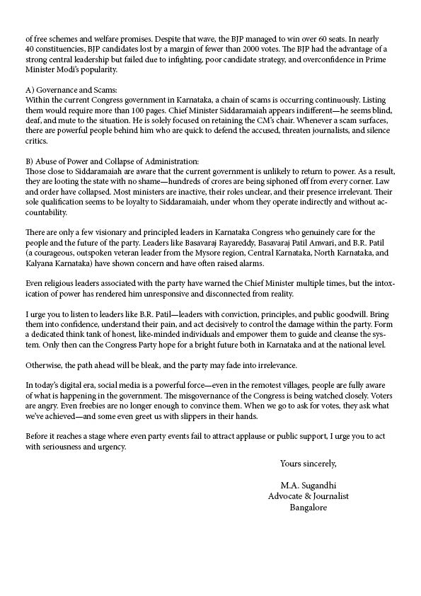 ೧೩೦ ವರ್ಷದ ಮುಪ್ಪಾವಸ್ಥೆಯಲ್ಲಿ ಮುರಿದುಬೀಳುತ್ತಾ ನಡೆದಿರುವ ಕಾಂಗೈ ಪಕ್ಷಕ್ಕೆ ಈ ಗತಿ ಬರಲು ಕಾರಣ ಪಕ್ಷದಲ್ಲಿ ನೀತಿ, ಸಿದ್ಧಾಂತ ಇಲ್ಲದೇ ಇರುವುದು. ಹೊಗಳು ಭಟ್ಟಂಗಿತನದಿoದಲೇ ಮುಖ್ಯಮಂತ್ರಿಗಳನ್ನು ಓಲೈಸಿ ಆಯಕಟ್ಟಿನ ಜಾಗೆ ಹಿಡಿದು ಖಮಾಯಿಸುವದೇ ತಮ್ಮ ಜೀವನದ ಪರಮೋದ್ದೇಶವೆಂಬoತೆ ನಡೆದುಕೊಳ್ಳುತ್ತಿರುವ ಕೆಲವು ಜನರಿಂದಾಗಿ ಪಕ್ಷದ ಮಾನ ಮರ್ಯಾದೆ ಹರಾಜಾಗುತ್ತಿದೆ. ದೇಶದಲ್ಲಿ ಕರ್ನಾಟಕ ರಾಜ್ಯವು ಲಂಚಭಾಕ ರಾಜ್ಯಗಳ ಪಟ್ಟಿಯಲ್ಲಿ ಅಗ್ರಸ್ಥಾನದಲ್ಲಿರುವುದು ಪಕ್ಷಾಭೀಮಾನಿಯಾಗಿರುವ ಬಿ.ಆರ್. ಪಾಟೀಲರಿಗೆ ಬೇಸರ ತರಿಸಿದೆ. ನೋವಾಗಿರುವ ಕಾರಣಕ್ಕೇನೇ ಪಕ್ಷಕ್ಕೆ ಮುಜುಗರವಾದರೂ ಆಗಲಿ ಎಂದು ರೋಷಿ ಹೋಗಿ, ಈ ಥರಹ ಅವರು ಸಾರ್ವಜನಿಕವಾಗಿ ಹೇಳಿಕೆ ಕೊಡುತ್ತಿರುವುದು ಕಂಡು ಬರುತ್ತಿದೆ. ಕಾಂಗೈ ಪಕ್ಷದಲ್ಲಿ ಇಂಥಹವರ ಪ್ರಮಾಣ ಹೆಚ್ಚಾಗಬೇಕು. ಆದರೆ ಪಕ್ಷದ ಹಿರಿಮೆ ಗರಿಮೆ ಹೆಚ್ಚಿಸಲು ಪ್ರಾಮಾಣಿಕವಾಗಿ ದುಡಿಯುತ್ತಿರುವ ಸಚಿವರು ಪದಾಧಿಕಾರಿಗಳು ಕಾರ್ಯ ಕರ್ತರಿಗೆನೇ ತುಳಿದು ಗಹಗಹಿಸಿ ನಗುತ್ತಿದ್ದಾರೆ. ಅಂತಹವರ ಟೊಂಕ ಮುರಿಯುವ ಕೆಲಸ ಪ್ರಾರಂಭವಾದಾಗಲೇ ಪಕ್ಷದಲ್ಲಿ ಹೆದರಿಕೆ, ಶಿಸ್ತು ತರಲು ಸಾಧ್ಯ.
