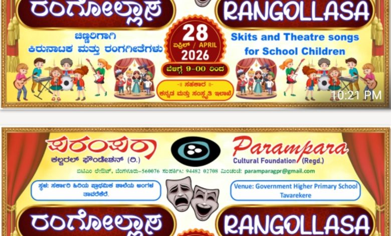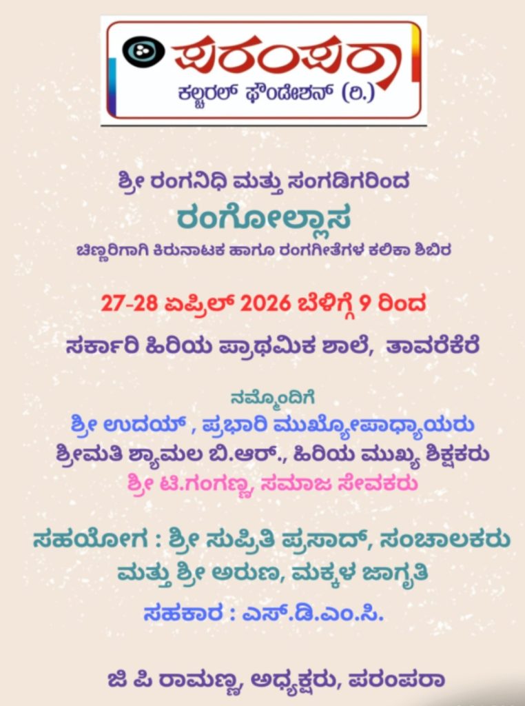 ಇದೇ ತಿಂಗಳ 27 ಮತ್ತು 28ರಂದು ಬೆಳಗ್ಗೆ 9ರಿಂದ ಅಪರಾಹ್ನ 1.30ವರೆಗೆ ಪರಂಪರಾ ಕಲ್ಚರಲ್ ಫೌಂಡೇಶನ್ ವತಿಯಿಂದ 1ನೇ ತರಗತಿಯಿಂದ 7ನೇ ತರಗತಿವರೆಗಿನ ಮಕ್ಕಳಿಗಾಗಿ ಕಿರುನಾಟಕ ಮತ್ತು ರಂಗಗೀತೆಗಳ ಶಿಬಿರವನ್ನು ನಡೆಸಲಾಗುತ್ತಿದೆ.